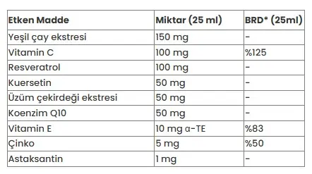 Deiyonize Su, Yeşil Çay Ekstresi, Resveratrol, L-Askorbik Asit, Kıvam Artırıcı (Ksantan Gam), Nar Aroma vericisi, Koenzim Q10, Kuersetin, Üzüm Çekirdeği Ekstresi, Asitlik Düzenleyici (Sitrik Asit), DL-Alfa-Tokoferil Asetat, Koruyucular (Potasyum Sorbat ve Sodyum Benzoat), Çinko Sülfat Monohidrat, Tatlandırıcı (Sukraloz), Astaksantin.