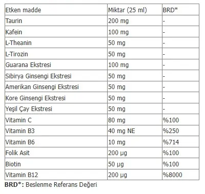 Taurin, Kafein, Guarana ekstresi, Sibirya Gingsengi ekstresi ve Vitaminler içeren sıvı takviye edici gıda.
