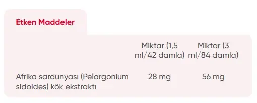Saf su, Nem verici (Sorbitol), Kıvam arttırıcı (Gliserol), Pelargonium sidoides (Afrika sardunyası) kök ekstraktı, Koruyucu (Potasyum sorbat), Asitlik düzenleyici (Sitrik asit).