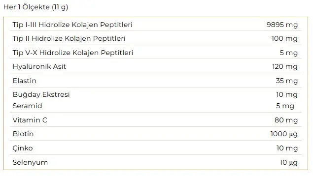 Collagen Complex Powder, ayrıca her ölçekte 5 tip kolajenin yanında, Seramid, Elastin, Hyalüronik asit, Çinko, Biotin, Selenyum, Buğday Ekstresi ve C vitamini de içermektedir.