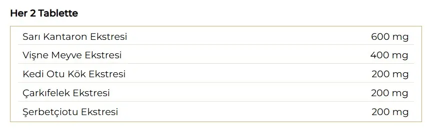 Sarı Kantaron Ekstresi, Vişne Meyve Ekstresi, Kediotu Kök Ekstresi, Çarkıfelek Ekstresi ve Şerbetçiotu Ekstresi İçeren Takviye Edici Gıda.