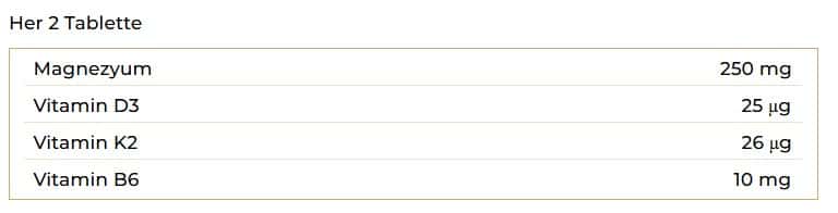 Mikrokristalin Selüloz (E 460 (İ), Çapraz Bağlı Sodyum Karboksi Metil Selüloz (E 468), Kalsiyum Karbonat (E 170), Yağ Asitlerinin Magnezyum Tuzları (E 470b), Hidroksi Propilmetil Selüloz (E 464), Polietilen Glikol (E 1521), İzomalt (E 953), Polivinilprolidon (E 1201), Silikon Dioksit (E 551).