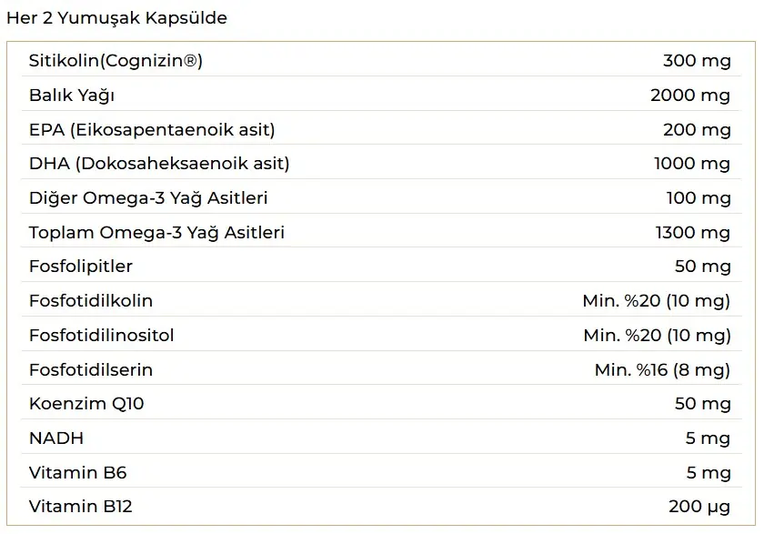 Beyin ve sinir sistemini destekleyen, sitikolin ve omega 3 içeren bir üründür.