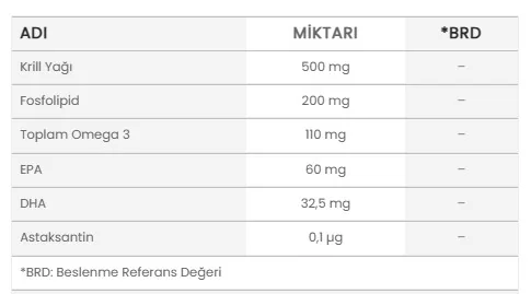 Bileşiminde omega 3 yağ asitleri ile birlikte astaksantin bulunmaktadır.