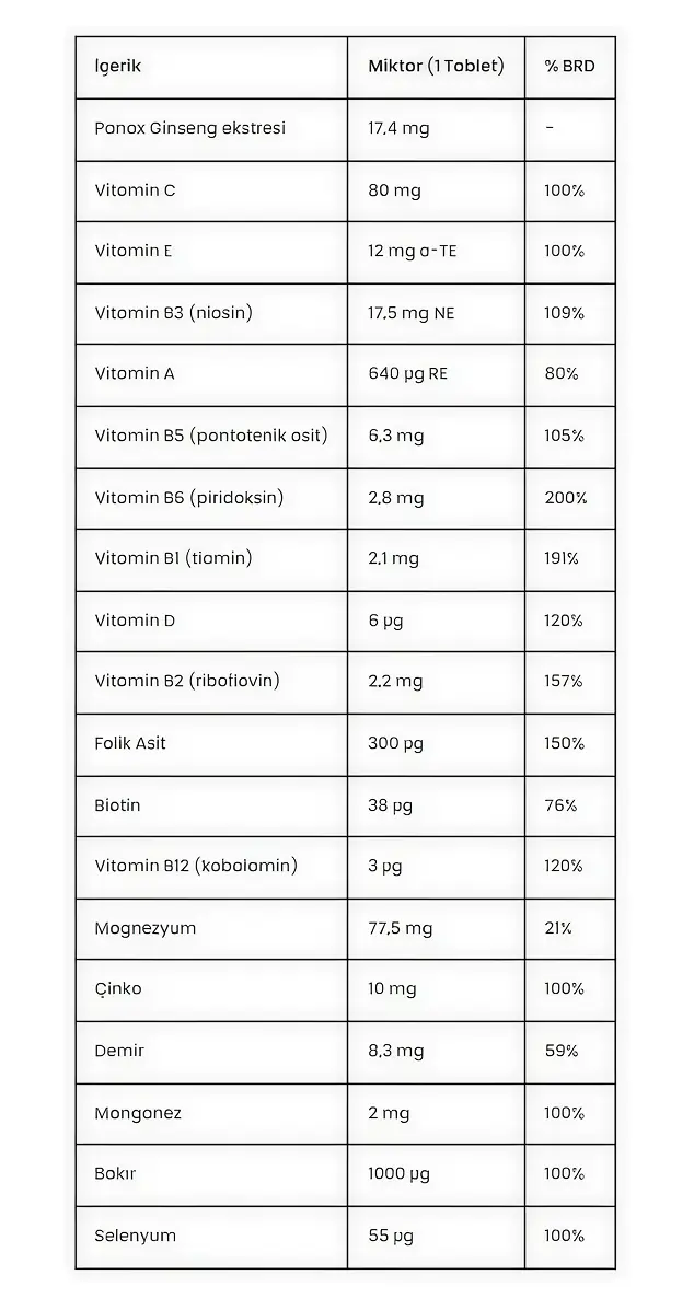 Multivitamin ve mineraller ile ihtiyaç duyulan normal enerji oluşum metabolizmasına, yorgunluk ve bitkinliğin azalmasına, bağışıklık sisteminin normal fonksiyonuna katkıda bulunur.