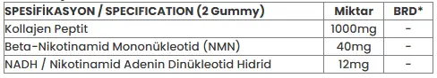 Stabilizör: Maltitol, Deiyonize Su, Kollajen Peptit, Jelleştirici: Pektin, Asitlik Düzenleyici: Sitrik Asit, Beta-Nikotinamid Mononükleotid (NMN), Aroma Verici: Ahududu Aroması, Tatlandırıcı: Sukraloz, NADH / Nikotinamid Adenin Dinükleotid Hidrit, Renklendirici Pancar Kökü Kırmızısı
