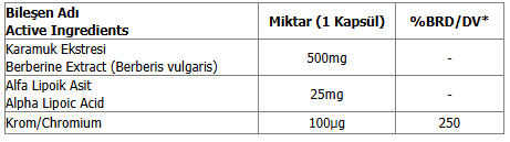 Karamuk Ekstresi (Berberis vulgaris), Maltodekstrin, Bitkisel Kapsül (Hidroksipropil Metil Selüloz, Renklendirici (Demir Oksitler ve Hidroksitler), Alfa Lipoik Asit, Topaklanmayı Önleyiciler (Yağ Asitlerinin Magnezyum Tuzları, Silikon Dioksit), Krom Pikolinat.