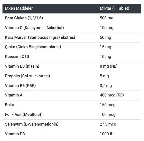 Beta Glukan 1,3/1,6 Kara Mürver ve Propolis içeren takviye edici gıdadır.